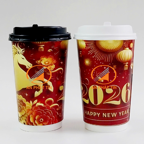 Ly giấy 18oz 2 lớp New Year Ngựa là một trong những sản phẩm được nhiều người ưa chuộng nhất. Nguyên liệu để tạo nên ly này là giấy trắng tinh khiết 100% nhập khẩu trực tiếp từ Indonesia có tráng PE. Sản phẩm thường được sử dụng để đựng nước uống, trà sữa, nước ngọt, cafe…